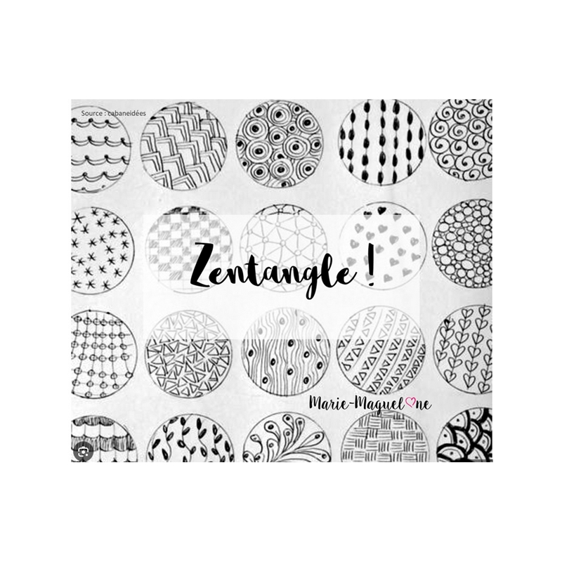 Méthode de dessin intuitive, fondée sur la répétition de motifs simples appelés "tangles". Chaque motif est constitué de formes de base (lignes, points, courbes, croix…), dessinées à main levée dans un petit carré de papier de 9x9 cm.